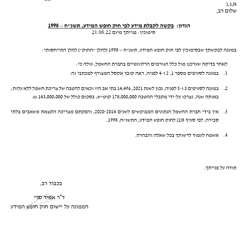 בקשת המידע הוגשה במסגרת הקליניקה לחופש המידע במכללה למינהל. לדברי עו"ד אור סדן מהתנועה לחופש המידע ומנחה הקליניקה. "דובר רבות בעבר על ההטבה שניתנה לעובדי חברת החשמל, ונדמה שרבים מכירים את המערכון המוכר של זהו זה שבו המזגן עובד במקביל לתנור. כעת, נראה שהנתונים מעידים על כך שהיעדר הגבלה סבירה של צריכת החשמל בחינם, מובילה לצריכה מוגברת של חשמל. הדבר מעלה שאלות רבות, בין היתר אם הבינו מלכתחילה את ההשפעה הכלכלית של ההטבה, בשנים שבהן מחיר החשמל עולה, וכך גם על ההשפעה הסביבתית של צריכת חשמל מוגברת. מדובר ברשות ציבורית ולספק החשמל המרכזי של המדינה, ומובן שהן הפגיעה באקלים והן הפן הכלכלי רלוונטיים לכלל".