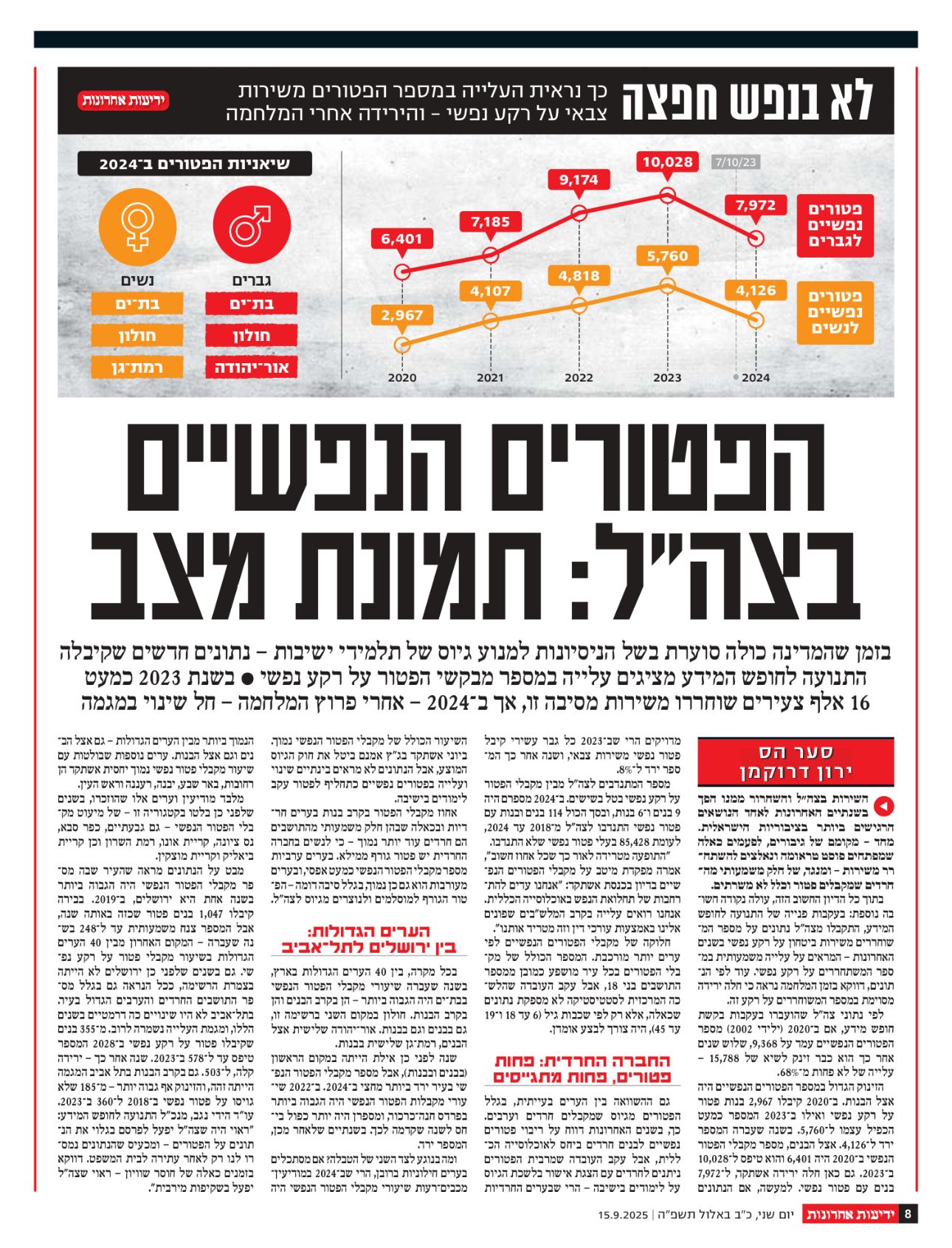 אצל הבנים, מספר מקבלי הפטור הנפשי ב-2020 היה 6,401 והוא טיפס ל-10,028 ב-2023. ב-2024 חלה ירידה ל-7,972 בנים עם פטור נפשי. הנתונים מעודכנים לסוף ינואר 2025.