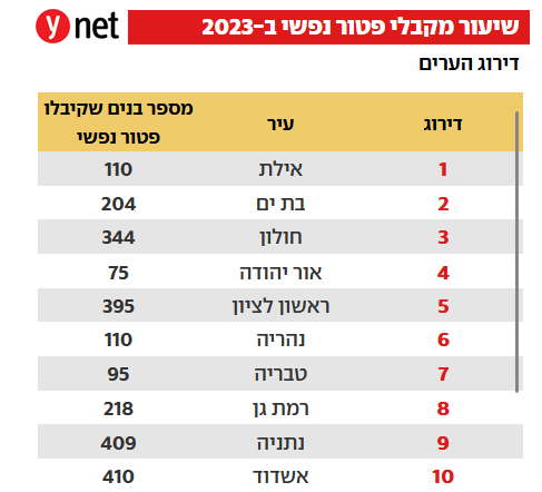 מקבלי פטור נפשי משירות בצה"ל – לפי יישובים