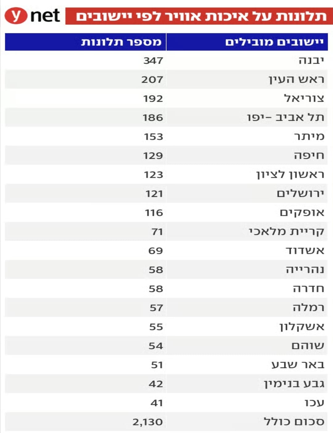העיר המובילה במספר התלונות של מפגעי פסולת, בשל המפגעים הנגרמים משריפות הפסולת היא ראש העין ולאחר מכן שוהם, כפר מנדא ונצרת. בתלונות על איכות האוויר מובילות יבנה וראש העין ולאחר מכן מושב צוריאל שליד מעלות. את המקום השלישי תופסת תל אביב ובהמשך מיתר, חיפה, ראשון לציון, ירושלים ואופקים.
